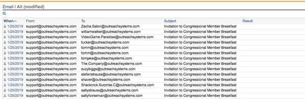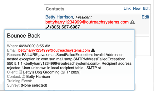 All emails sent from Neoserra will be logged, for 90 days, under the Administration|Email Operations Center menu option. Here you will be able to see all successes as well as all bounce backs. Any email address that is bounced back, will appear in red highlighted text within the Neoserra interface. You can hover over the informational triangle to find out why the message bounced back.