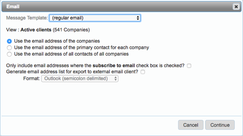 Optionally, you can decide to use your default email application to send your message, in which case you will want to check the "Generate email address list for export to external email client?" checkbox. Click Continue when you are ready to proceed.