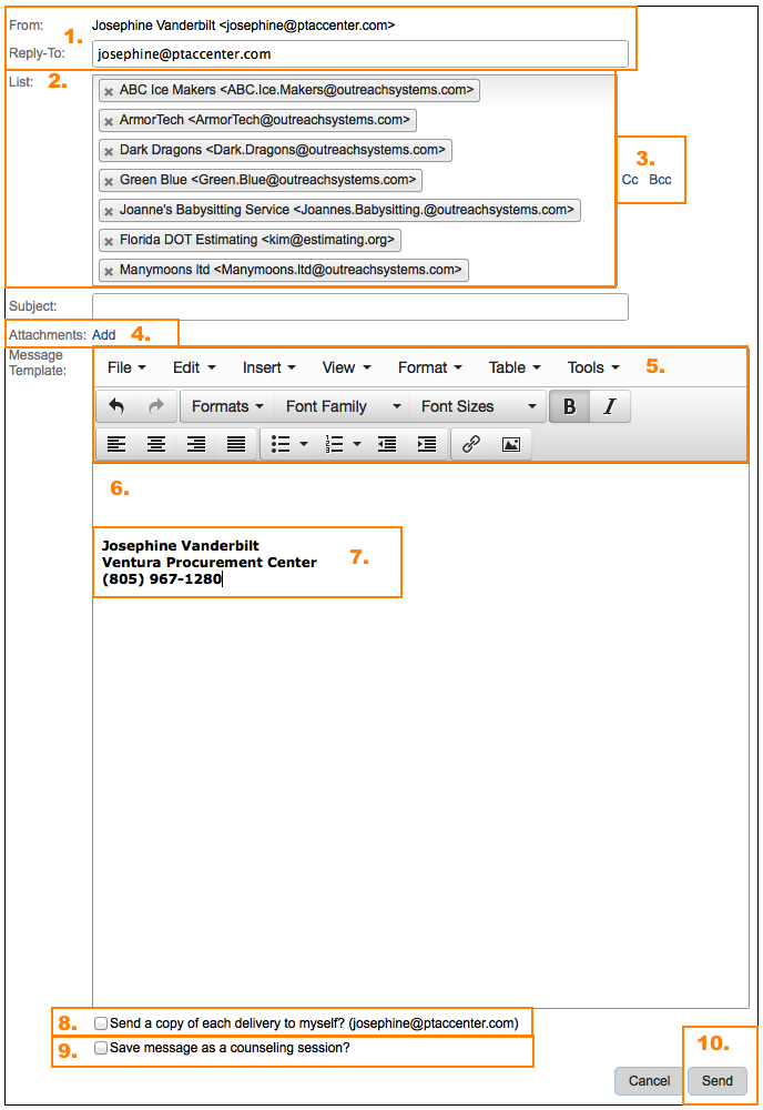 Be aware that Neoserra will create a counseling session for each and every recipient in the "List" field. Thus, if you are sending an email to 10 recipients, then 10 separate counseling sessions will be created. If you should need to delete these counseling sessions afterwards, then you will need to delete them 10 times.