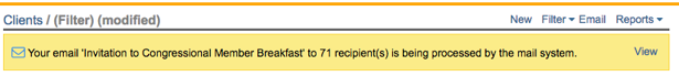 - Upon clicking "Send" Neoserra will send your email messages in the background. Upon returning to the filter view you will see that the message is being processed: