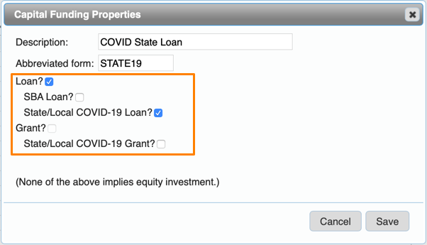In April 2020, the SBA added two additional federal COVID-related loan types to be exported. Additionally, SBA designated an internal code for the various state and/or local COVID funding that might be offered in your State. Since each State will have their own locally sponsored loan and grant programs, these will need to be entered into Neoserra as custom capital funding types by your database administrator. Following the steps outlined above, it is important to mark the COVID loan/grant programs offered in your state accordingly: