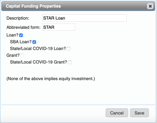 5. If you selected "Loan?" in the previous step, you optionally have the ability to indicate whether or not it is an SBA loan by selecting the secondary "SBA?" check box. If your new capital funding type does qualify as an SBA loan, it's very important that you designate that here.