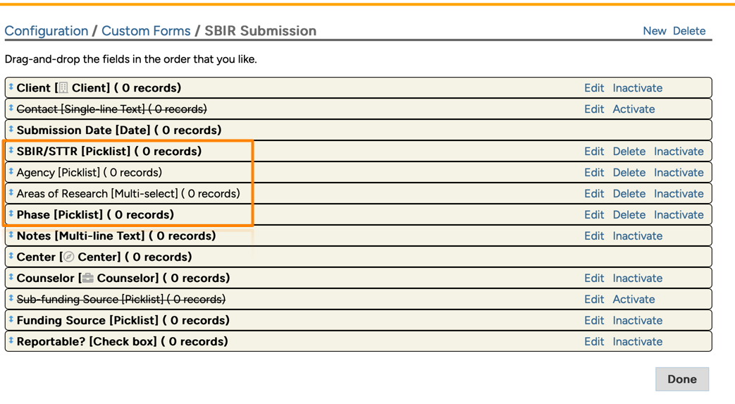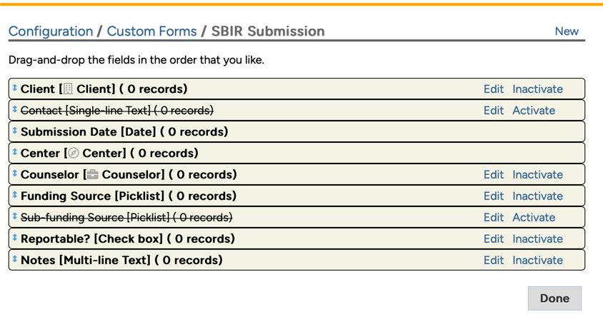 You can edit or inactivate the individual fields found on a custom form from the same interface in which they were created. To edit/inactivate a field found on a custom form, follow the next set of steps: