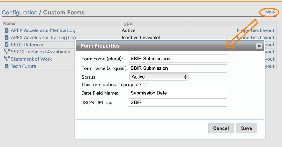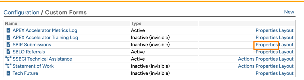 New forms are created under the Configuration menu of Neoserra and only administrators will have access to this functionality. Click "Custom Forms" from the Configuration menu. Then, with the Custom Forms interface open, click the "New" hyperlink, which is located in the upper right corner, as highlighted in the next graphic.