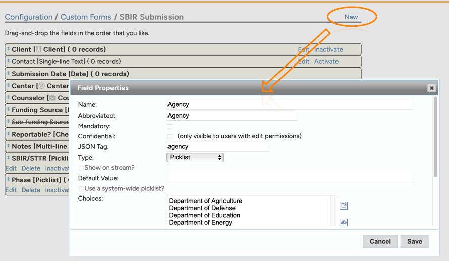 Next, you will want to add your own fields to your custom form. To add a new field click the "New" link in the upper right corner of the screen: