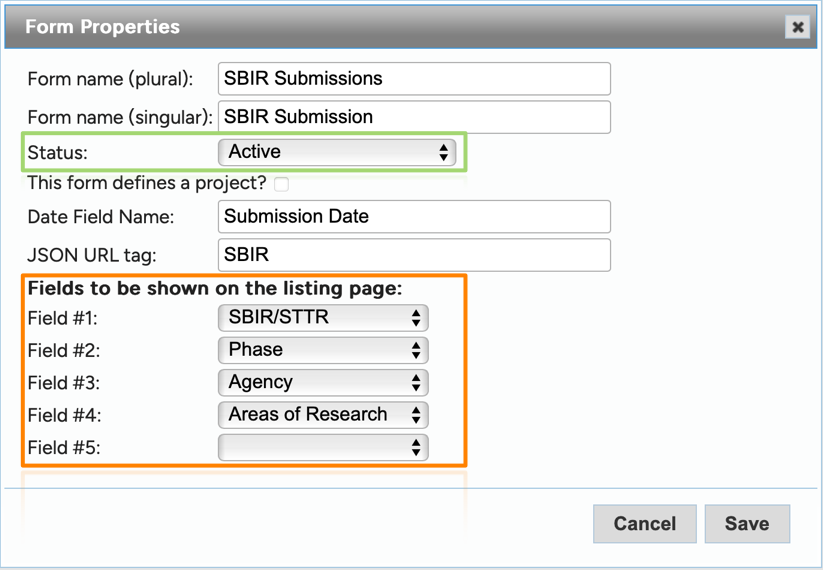 Highlighted in green, you can choose to activate the form. And highlighted in orange your can choose which columns will appear on the summary listin page in Neoserra: