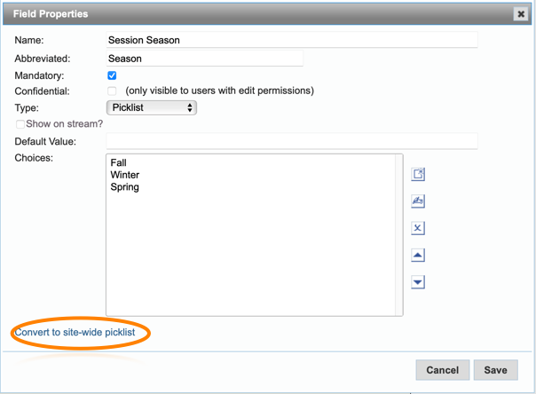 Creating a system-wide picklist may be beneficial if this is a drop down list that you frequently use, or if it is a list that you anticipate updating regularly. In the screenshot below, we are using a system wide picklist. In this case, the picklist is a custom created one, but it has been made into a system-wide picklist so that it can be used by multiple forms: