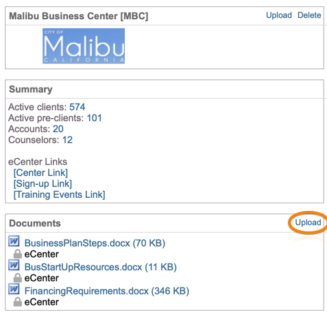 You can upload documents as part of your center record, which then may be shared with clients on eCenter Direct. Go to View|Centers and click on your center. In the right hand margin, within the "Documents" panel you will see the option to upload your documents: