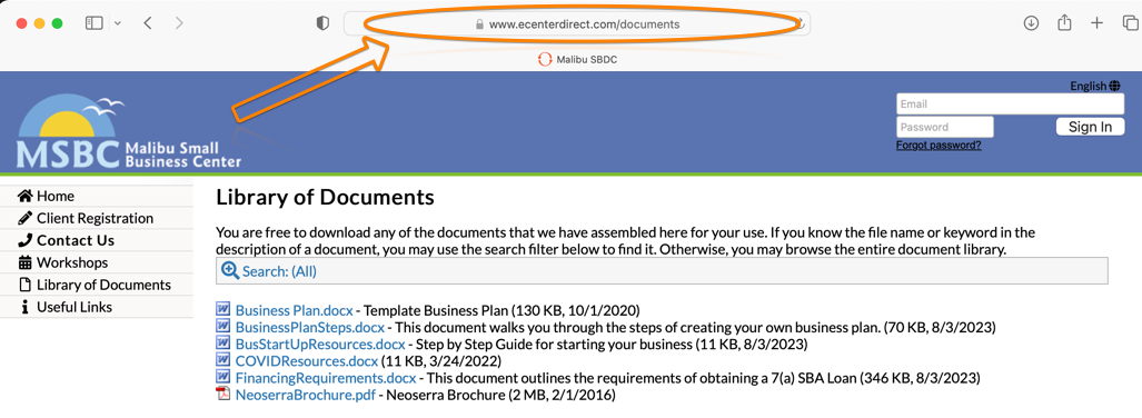 At the top of the page, take note of the URL where the documents are stored. This is the URL that you can include in your email message letting clients know where they can find the documents. Keep in mind that the URL in the screenshot above is ONLY for sample purposes, you will need to get your actual URL for your program.