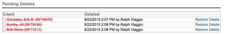 To permanently remove the pending deletes from the system, the system administrator will need to log into administrator-mode and choose the Administration|Pending Deletes menu option. From here they can individually delete and/or restore the client record and all their associated counseling sessions:
