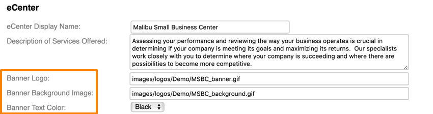 Individual centers can automatically overwrite the default eCenter logo for their specific center by posting their own logo on their center record, as described above. If an individual center wants to post a logo to eCenter Direct that is different from the default logo and it is different from their Neoserra logo, then they can add this logo by going to View|Centers and selecting the center from the list. Edit the center record and scroll to the "Banner Logo", "Banner Background Image", and "Banner Text Color" fields and update them accordingly: