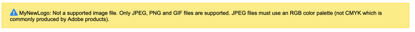 It is important to note, that Neoserra and eCenter Direct do not support JPEG with a CMYK color model, only the RGB color model is supported. You will see the following error whem importing a logo with the CMYK color model:
