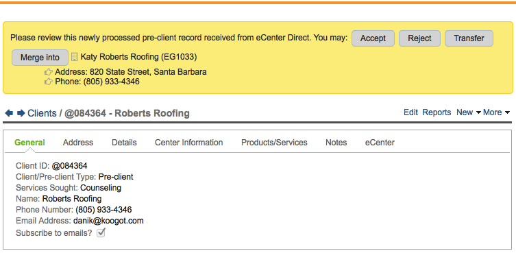 When processing new client records received from eCenter Direct, you will notice the yellow bar at the top of the page if there are any duplicate records detected in the database with the same address, same email addres, same phone number or same company name.