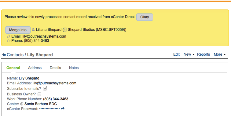 Similarly, when processing new contact records received from eCenter Direct, you will notice the same yellow bar at the top of the page when a duplicate record is found: