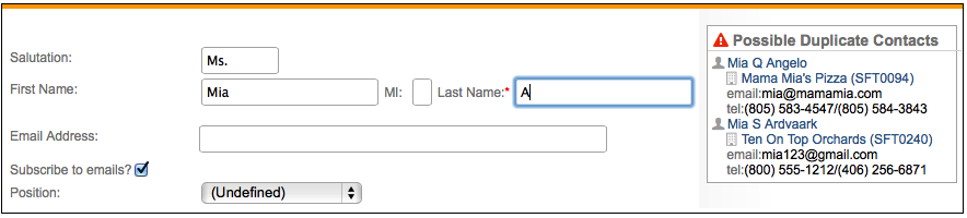 When adding a new contact in Neoserra, you will notice that the possible duplicate contacts immediately appear in the right hand column. The more letters of the person's name you type, the more the duplicates are narrowed down.