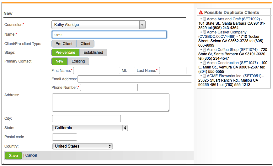 When adding a new client in Neoserra, the possible duplicate company names immediately appear as you start typing. The duplicates will appear to the right of your data entry screen:
