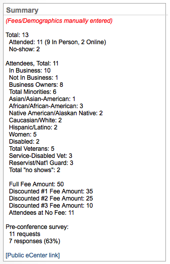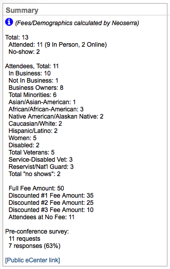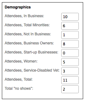If your program is SBA funded, then you should be aware that only attendees that are listed in the attendee list and who are identified as having attended, will count as active clients. In other words, if you manually enter in the attendee count then you will get credit for the number of attendees, but because Neoserra doesn't know who the attendees are, these clients will not count as clients "served".