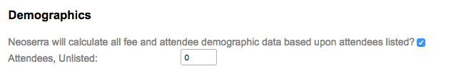 It is important to note, that by default the "Neoserra will calculate all fee and attendee demographic data based upon attendees listed?" checkbox is always turned on when creating new events, unless you copy an event that has the checkbox turned off.