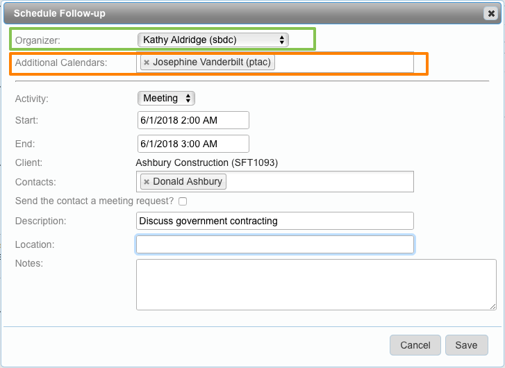 - Send the contact a meeting request - If you would like to send a meeting request email to the contact(s) selected in the previous field, then check this checkbox.