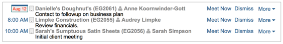If you have more than 20 missed appointments, then Neoserra will only show 20 of your oldest missed appointment. You can "complete" an appointment either by making a call, sending an email or meeting with the client via the links provided. When you click the "Call Now" or "Meet Now" links, a counseling session interface will be presented to record your counseling notes. You can also "Dismiss" an appointment which will keep it on your Neoserra calendar but will remove it from the home page and client page and no counseling session interface will be presented. Neoserra will automatically dismiss all appointments that are more than 30 days old.
