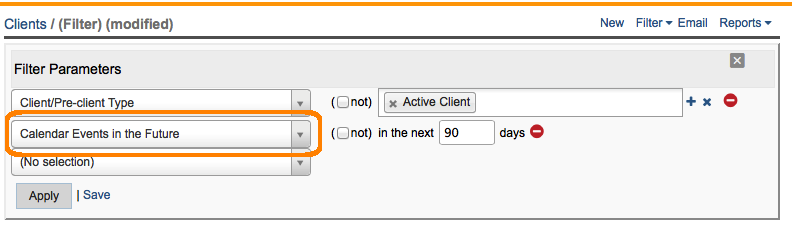 You can filter on calendar appointments in the future. A special filter parameter called: "Calendar Events in the Future" is available from the clients filter interface that allows you to search for all clients with upcoming appointments: