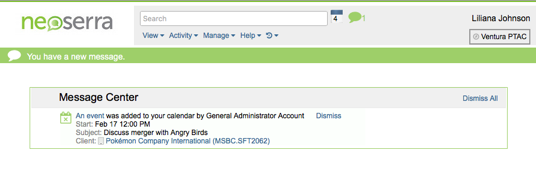 Similarly, you can configure your colleagues to be allowed to view, edit or add appointments on your calendar. Users with edit permissions to your calendar can then also delete your appointments. When someone makes an appointment on your behalf, a message will appear in the Neoserra Message Center: