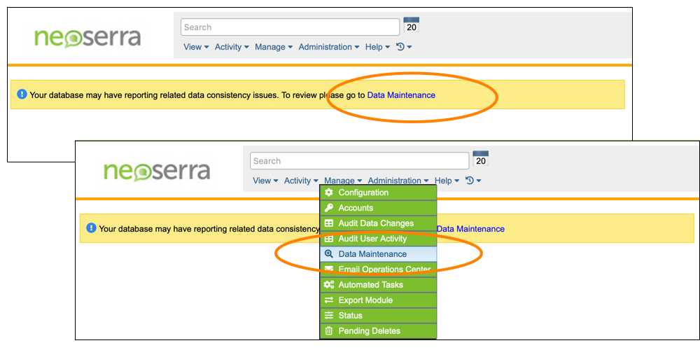 There are a number of database checks that Neoserra performs that are reported at the top of the Neoserra dashboard page in the yellow ribbon. The yellow ribbon is only displayed for the system administrator to see. The maintenance pages can also be accessed from the Administration|Data Maintenance menu selection: