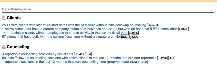 | in-business clients without employees that have activity in the current fiscal year | Neoserra will provide a list of clients that have a current company status of "in-business" or "start-up" but who do not have any employees listed on their client record. You should review the client record to determine if either the business status of the client should be changed to pre-venture, or whether the record needs to be updated with the correct number of employees, keeping in mind that the sole proprietor counts as a job. |