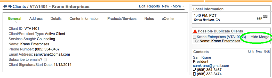 The merge feature is offered within the Possible Duplicates panel on the right hand side of either the contact or the client record. There are two commands you can use here: "Merge" (as discussed below), and "Hide." If Neoserra is identifying a "false positive" then you can click on the "Hide" option to make the possible duplicates disappear for all Neoserra users. As you can see, you can easily expose the possible duplicate(s) again, if/when necessary: