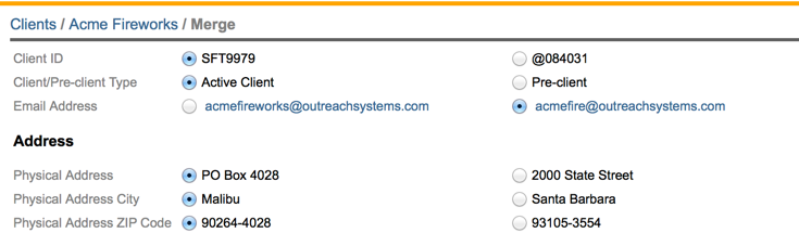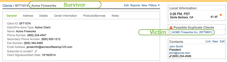 In the screenshot above, the client record ("ACME Fireworks") from which the merge process is initiated, is the survivor record, and the client record being merged ("Acme Fireworks, Inc."), is the victim record.