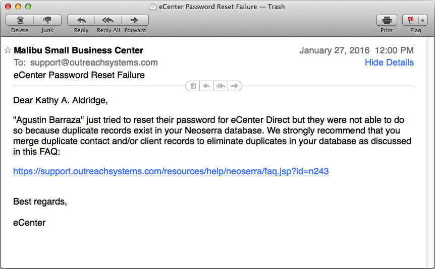 You may receive an email, similar to the one below, when one of your clients is trying to log into eCenter Direct but they have forgotten their password and they are trying to retrieve it but eCenter can't provide it to them because multiple contact records exist in your Neoserra database with the same email address: