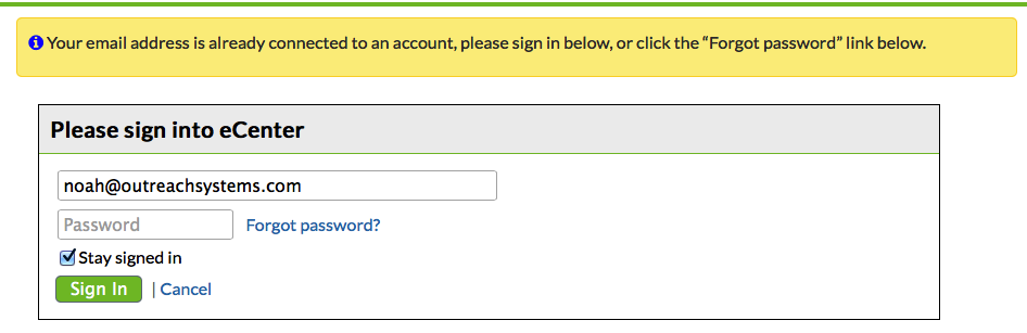 The problem is a result of having multiple contacts in the database with the same email address. When an existing contact visits your eCenter Direct web site and they try to sign up for an event using an email address that already exists in the database, they will be presented with the following screen: