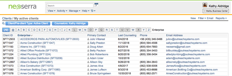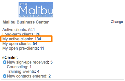 A link to all of your active clients can always be found on the Neoserra home page in the upper right hand panel: