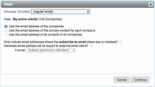 Next, you will need to decide if you want to use the Neoserra email application or your own default email application. If using the Neoserra application then click Continue to formulate your email and send it. To send your email using your default email application such as Outlook, Google Mail or Mac Mail, make sure you check the "Generate email address list for export to external email client? " checkbox and choose the format you want. Once you have checked this box, then click "Continue" to get to the following interface: