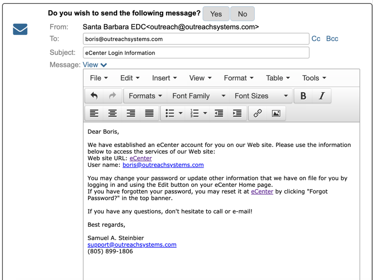 eCenter Direct will not be able to provide the person with their password, since they essentially have multiple passwords in the Neoserra database. The contact will be provided with the email address of the default counselor(s) associated with center(s) under which their records were created. These same counselors will also receive an email when a client attempts to log in without success due to a duplicate record issue: