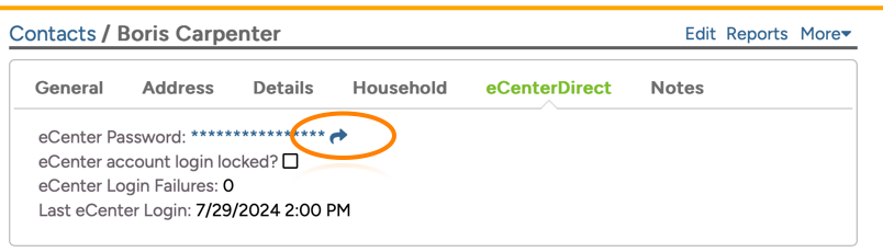 If a contact has forgotten their password, then the best thing to do is to tell them to go to eCenter Direct and click on the "Forgot Password?" link in the top banner. Neoserra also offers an email template that can be used to give the client the necessary details on how to retrieve their password. Simply click on the arrow on the contact record next to the eCenter Password field: