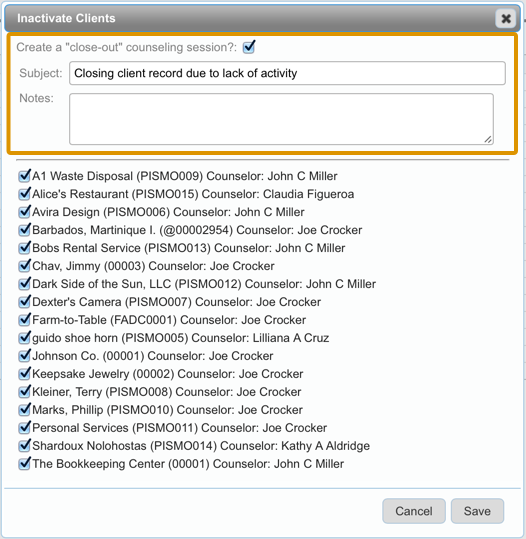 - At this point you can either click "Save," and all checked clients will be inactivated without an accompanying close-out session; or you can check the "Create a "close-out" counseling session?" checkbox at the top of the screen to document your action: