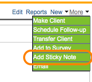 To add a sticky note go to the appropriate record and click More|Add Sticky Note: