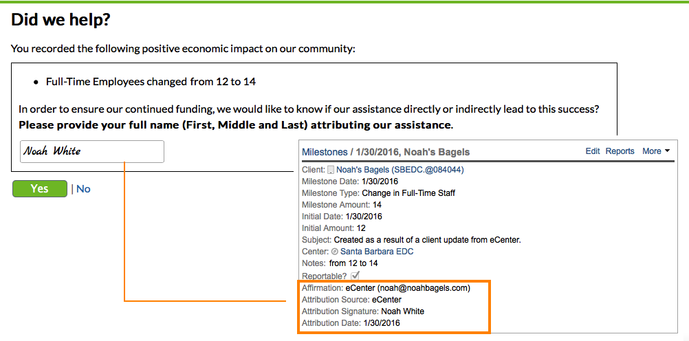 Again, when Neoserra and eCenter Direct are being used together then the client's affirmation is automatically logged when an update is made on eCenter Direct to the jobs and/or revenue fields of a client's record. However, an administrator, in administrator-mode, can disable the "Request attribution of assistance?" under the Administration|Configuration|eCenter Settings menu option in Neoserra:
