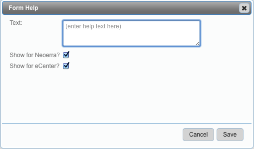 A check box will control whether the help is displayed on Neoserra, on eCenter Direct, or on both. Keep in mind that if a field is disabled on the data entry form, then the help information will not display. Furthermore, some fields may be presented under the "Field Help" menu option but these forms and fields are currently not available on eCenter Direct. As eCenter Direct evolves over time these help fields may come into play.