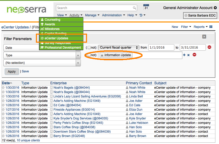 These records are intended to inform the Neoserra user anytime an update is made by a client via eCenter Direct. There are three different types of eCenter Updates available from the Activity|eCenter Updates menu selection: