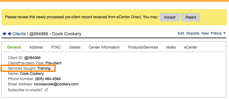 That being said, there are ways to distinguish clients created via the new client sign-up form versus an event registration. For one, the "Services Sought" field, on the client record, will indicate whether the client initially came to your program for training or for counseling purposes: