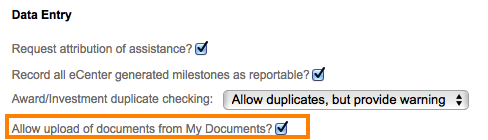Optionally, your system administrator can also configure your system to allow clients to upload documents from eCenter Direct to Neoserra. This is a global configuration setting that will apply to all centers and all clients logged into eCenter Direct. Administrators, in admnistrator-mode, can go to Administration|Configuration|eCenter Settings and check the option to "Allow upload of documents from My Documents," as shown in the following screenshot: