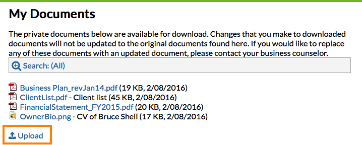Clicking on this link will show not only the documents that have been uploaded by the Neoserra user(s) for the client to review, but it will also provide the eCenter Direct user with an "Upload" option: