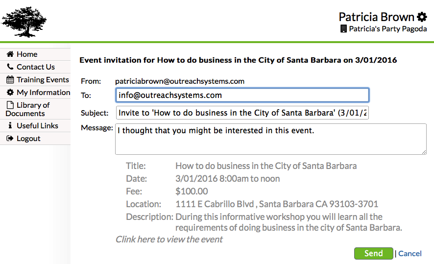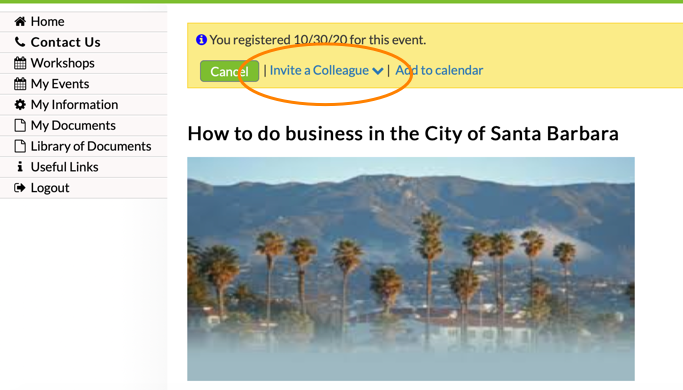 Clients may also want to invite colleagues (both colleagues within their company and colleagues outside of their company) to an event hosted by your program. The primary contact and/or business owner that is logged in to eCenter Direct can go to the "Training Events" page and click on an event and see the "Invite a Colleague" link: