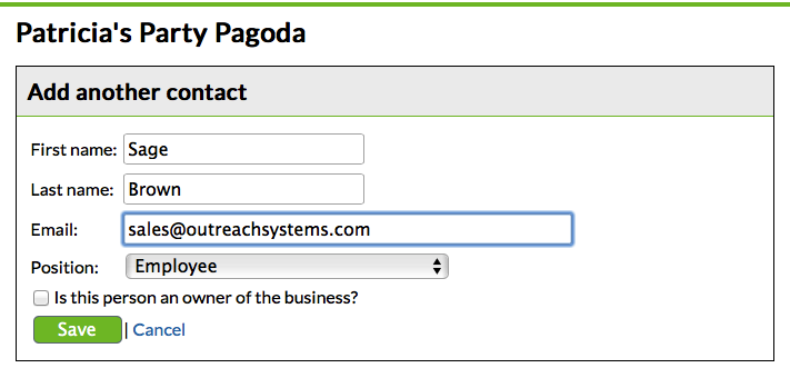 We will assume that the person attempting to add another contact to their company is the business owner/primary contact. When they click the "Add another contact" link they are asked to provide the new contact's name and email address. They can designate the new contact as a business owner, or not. If they do, then the newly invited person will also be able to edit the company record and add new contacts: