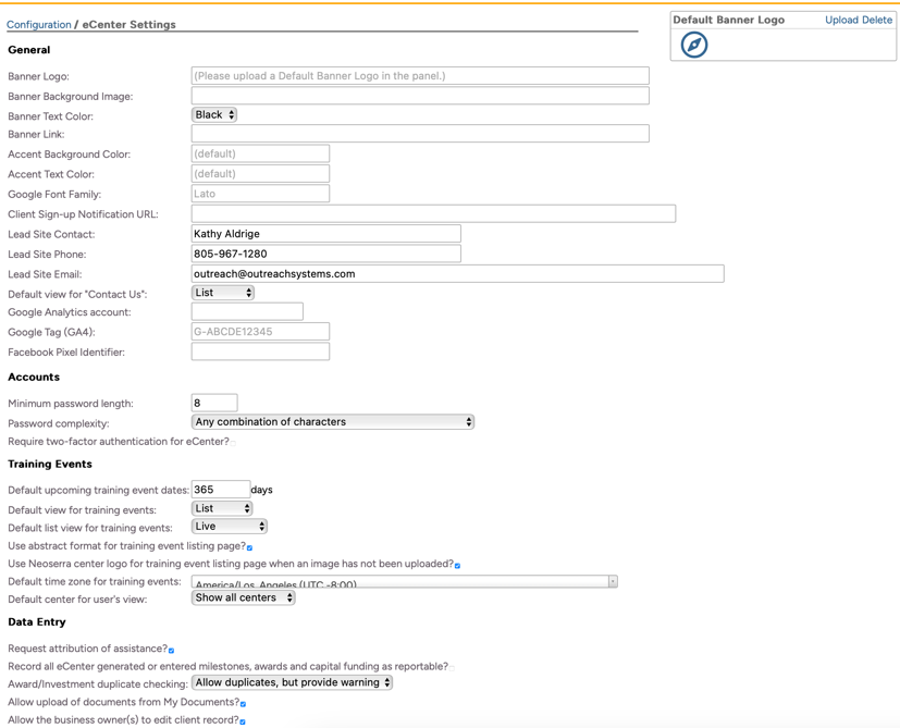 - Banner Logo: Load your logo in the "Default Banner Logo" panel on the page. Keep in mind that individual centers can override the default logo that is posted here. Individual centers can post their own logo (and background color ) on their respective center records, as discussed here.