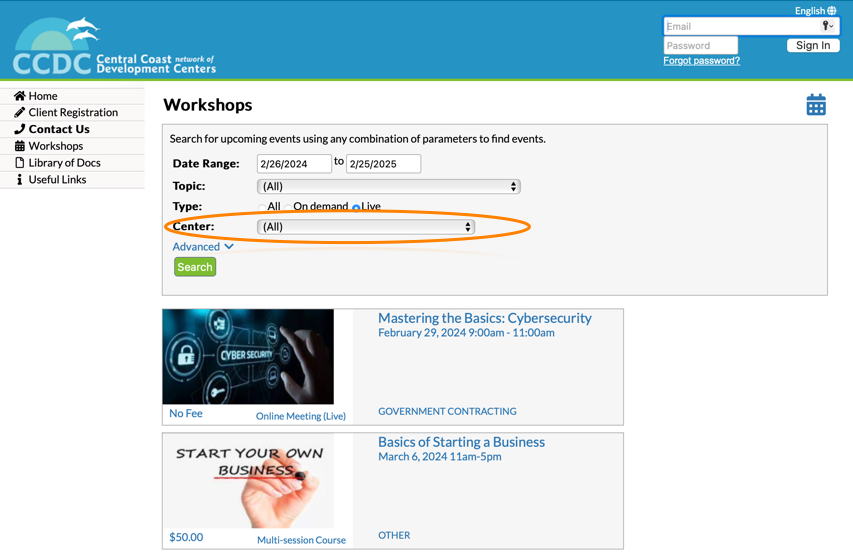 - Use center for user's view: When a client visits your events page on eCenter Direct, you can choose to either show all events from all centers, by default, or you can just present the events related to the center to which the client is assigned: