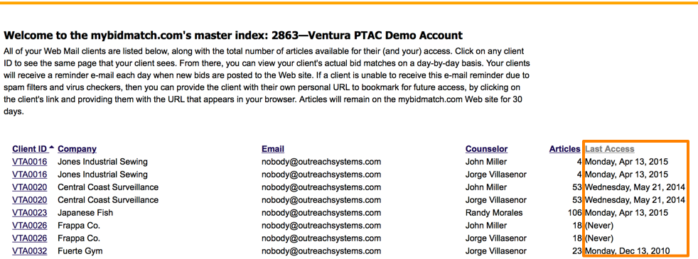 Clients whose bid match Output Format has been set to Web mail (mybidmatch.com) will have a private mybidmatch.com page where they can view their daily bid results. In fact, their mybidmatch.com page stores up to 30 days of bid match results for each client. If a client is setup to receive their bid matches via the Web mail then they will receive notification e-mails from your program whenever new bid matches are available. These e-mails will link the client to their own personal page on OutreachSystems' mybidmatch.com Web site, where they can view the newly posted bid matches as well as all bid matches posted in the last 30 days. But how do you know if a client is actually going to their private mybidmatch.com page? This FAQ will review the two methods you can use to monitor your clients' access of their mybidmatch.com page: