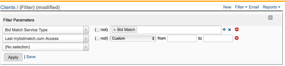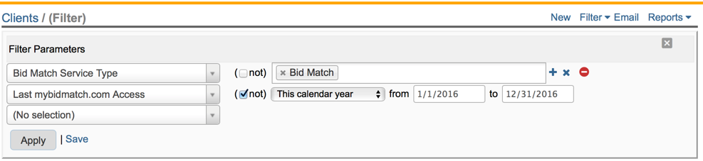 - Click Apply to see your results. The list of clients will represent all clients who have not accessed their private mybidmatch.com page during the period you specified. This list does not include the people who have never accessed. Keep in mind that the folks that have never accessed could be those clients who recently were set up and/or those clients who have not received any bid matches yet.